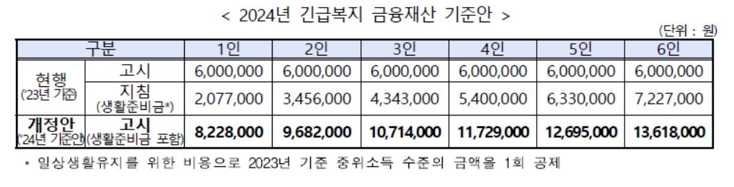 대상자 선정 기준은 금융재산입니다. 2024년 기준 중위소득을 반영하여 가구원수별 금융재산 금액으로 개선되었습니다. 지침과 고시로 이원화된 체계가 고시로 일원화되었습니다.